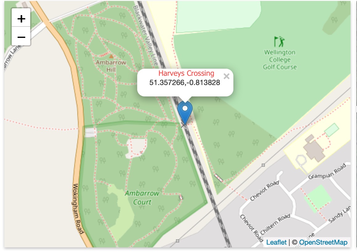 Harveys Public Level Crossing crosses (or rather crossed) the Reading to Guildford railway line south of Crowthorne Station on the West side of Ambarrow Court.